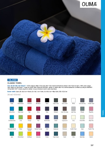 Size: 30×50-100×150 450g/m • 100% ringspun cotton • Tear-away label • Two emphasized bordures at towel ends • Dyed to match, 100% cotton hanger