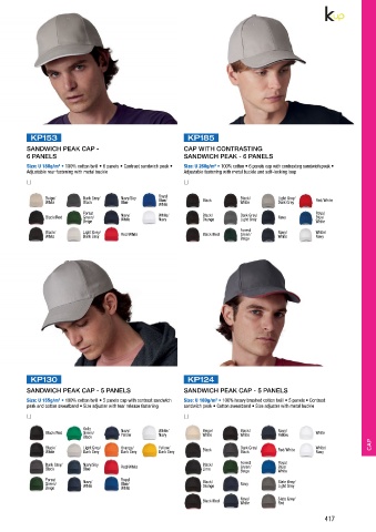 Size: U 180g/m • 100% cotton twill • 6 panels • Contrast sandwich peak • Size: U 260g/m • 100% cotton • 6 panels cap with contrasting sandwich peak •