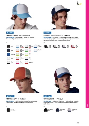 Size: U 150g/m • 100% polyester • 5 panels with easy print Size: U 300g/m • 60% cotton / 40% polyester • 5 panels • Classic Trucker