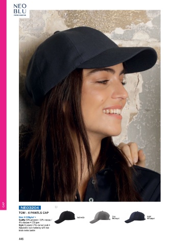 CAP NE03204 U TOM - 6 PANELS CAP Size: U 220g/m • Anthracite Gray Night 2 Melanged Melanged Quality: 64% polyester / 32% viscose / 4% elastane • 220 gsm Style: 6 panels • Pre-curved peak • Adjustable back fastening with mat black metal buckle 446