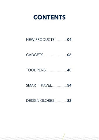 CONTENTS NEW PRODUCTS ..............04 GADGETS ...........................06 TOOL PENS ........................40 SMART TRAVEL .................54 DESIGN GLOBES ..............82