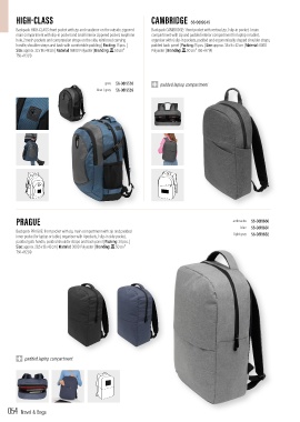 Backpack HIGH-CLASS: front pocket with zip and carabiner on the outside, zippered Backpack CAMBRIDGE: 1 front pocket with vertical zip, 1 slip-in pocket, 1 main