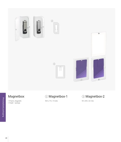 ② ① Magnetbox ① Magnetbox-1 ② Magnetbox-2 ▪ ▪ Plastic, magnetic 104 x 74 x 10 mm 94 x 44 x 22 mm ▪ ▪ Insert - sponge Personalized packaging 60