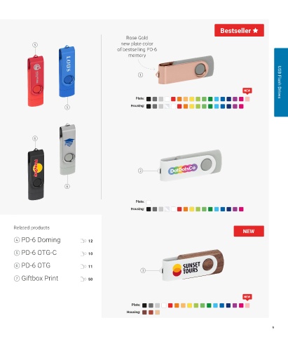 Bestseller Rose Gold ⑤ new plate color of bestselling PD-6 memory ① USB Flash Drives NEW Plate: ⑤ Housing: ⑥ ② ⑥ Plate: Housing: Related products NEW ④ PD-6 Doming 12 ⑤ PD-6 OTG-C 10 ⑥ PD-6 OTG 11 ③ ⑦ Giftbox Print 50 NEW Plate: Housing: 9