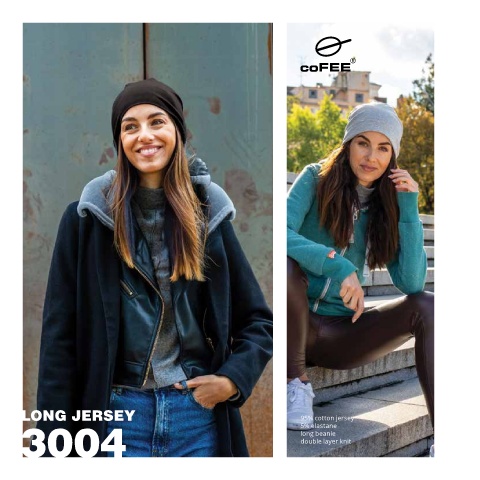 3004 LONG JERSEY 95% cotton jersey 5% elastane long beanie double layer knit 3 47 19 10 6 BLACK ASH GREY LIME ORANGE WHITE LONG JERSEY 95% cotton jersey 3004 long beanie 105 5% elastane double layer knit
