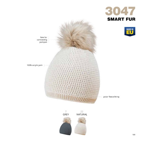 3047 SMART FUR fake fur contrasting pompon 100% acrylic yarn polar fleece lining 7 22 GREY NATURAL SMART FUR 100% acrylic yarn 3047 fake fur 169 polar fleece lining contrasting pompon