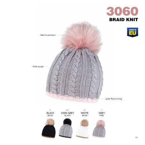 3060 BRAID KNIT fake fur pompon 100% acrylic polar fleece lining 3 47 6 7 BLACK DARK GREY WHITE GREY BEIGE BLACK BEIGE PINK BRAID KNIT 100% acrylic 3060 polar fleece lining 171 fake fur pompon