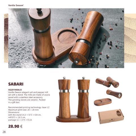 set with a stand. The mills are made of acacia Vanilla Season mill for pepper, salt or other