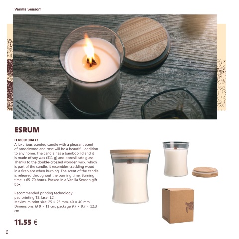to any home. The candle has a bamboo lid and it A scented candle with a pleasant smell and an extended