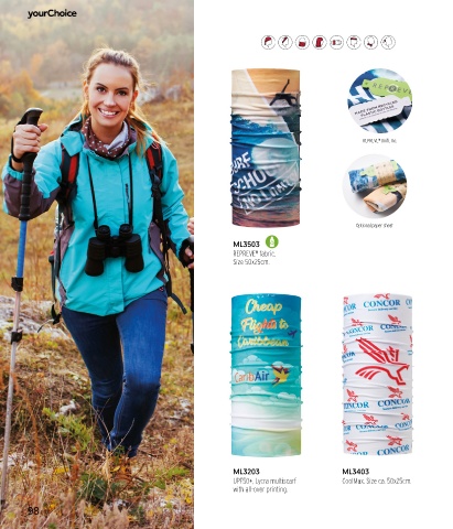 REPREVE Unifi, Inc. @ Optional paper sheaf ML3503 REPREVE fabric. ® Size 50x25cm. ML3203 ML3403 UPF50+, Lycra multiscarf CoolMax. Size ca. 50x25cm. with all-over printing. 98