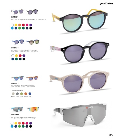 MPSG11 Round PC sunglasses in the colours of your choice. MPSG14 Round sunglasses with the rPET frame. MPSG13 Round wheat straw/PP Sunglasses. Wheatstraw colours Natural Grey Green Orange Blue MPSG32 PC Sports sunglasses in your design. 145