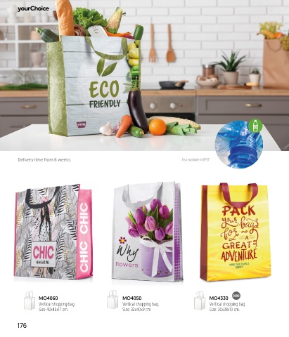 Delivery time from 6 weeks. Also available in RPET MO4060 MO4050 MO4330 3000 Vertical shopping bag. Vertical shopping bag. Vertical shopping bag. Size 40x45x17 cm. Size: 32x40x9 cm. Size: 30x38x10 cm. 176