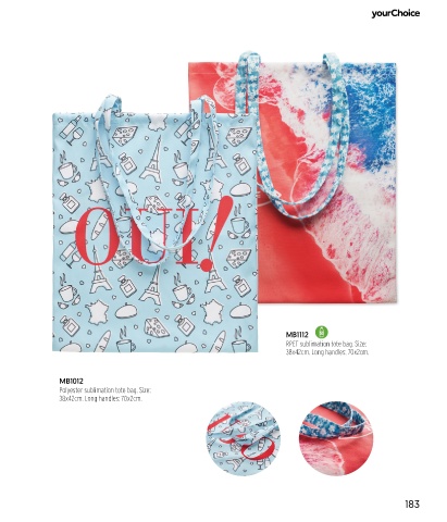 MB1112 RPET sublimation tote bag. Size: 38x42cm. Long handles: 70x2cm. MB1012 Polyester sublimation tote bag. Size: 38x42cm. Long handles: 70x2cm. 183