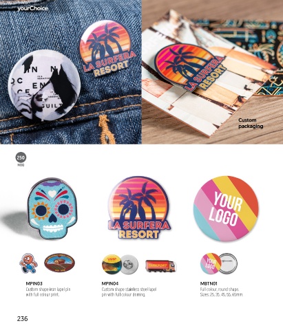 Custom packaging 250 MOQ MPIN03 MPIN04 MBTN01 Custom shape iron lapel pin Custom shape stainless steel lapel Full colour, round shape. with full colour print. pin with full colour doming. Sizes: 25, 35, 45, 55, 65mm. 236