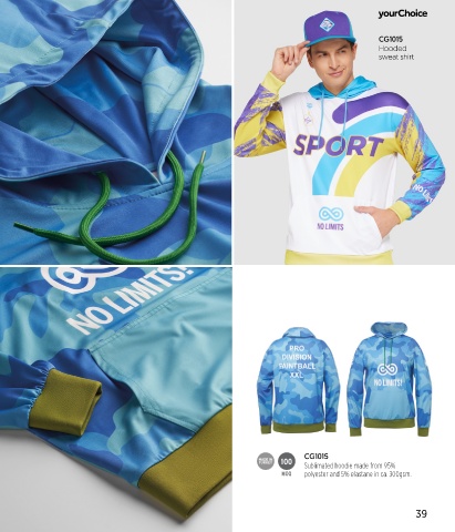 CG1015 Hooded sweat shirt CG1015 100 Sublimated hoodie made from 95% MOQ polyester and 5% elastane in ca. 300gsm. 39