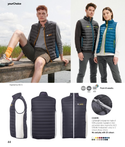 Inspired by SOL’S 100 500 From 8 weeks. MOQ MOQ CG1019 Lightweight bodywarmer made of 100% polyester. Available in men and women sizes. Inspired by SOL’S STREAM. Produced in 1 colour or 2 colours of your choice. Mix and play with 20 colours 44