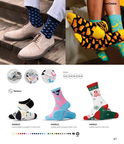 Sock sizes: 32-35 36-39 40-43 44-46 Bamboo MWBS23 MWBS22 MWBS21 Custom pattern jacquard no-show socks. Custom pattern jacquard ankle socks. Custom bamboo crew socks. PMS 50 MOQ 47