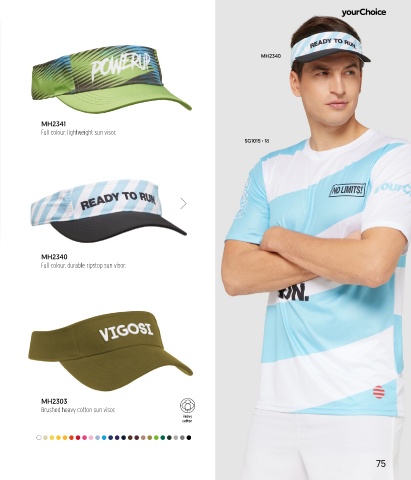 MH2340 MH2341 Full colour, lightweight sun visor. SG1015 › 18 MH2340 Full colour, durable ripstop sun visor. MH2303 Brushed heavy cotton sun visor. Heavy cotton 75