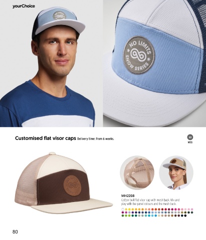 Customised flat visor caps Delivery time: from 6 weeks. 50 MOQ MH2208 Cotton twill flat visor cap with mesh back. Mix and play with the panel colours and the mesh back. 80