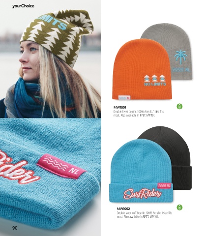 MW1001 Double layer beanie. 100% Acrylic. 1 size fits most. Also available in RPET: MW1101. MW1002 Double layer cuff beanie. 100% Acrylic. 1 size fits most. Also available in RPET: MW1102. 90