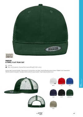 6 panel mesh cap with flat peak • 6 decorative stitching lines on the peak • 6 embroidered ventilation holes • Padded cotton sweatband •