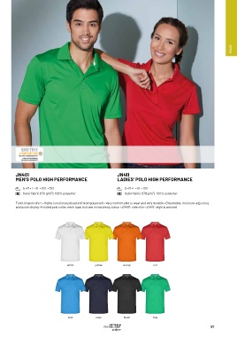 and quick-drying • Knitted polo collar, neck tape, buttons in matching colour • JN401: side slits • JN411: slightly waisted