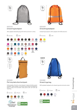 100% polyester. Flat, slim, urban backpack made with 60% recycled 210D polyester backpack with drawstrings and reinforced corners.