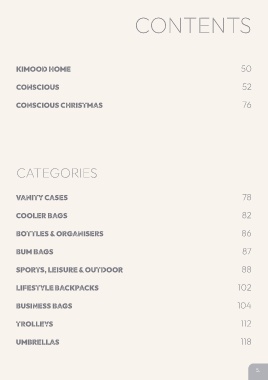 CONTENTS KIMOOD HOME 50 CONSCIOUS 52 CONSCIOUS CHRISTMAS 76 CATEGORIES VANITY CASES 78 COOLER BAGS 82 BOTTLES & ORGANISERS 86 BUM BAGS 87 SPORTS, LEISURE & OUTDOOR 88 LIFESTYLE BACKPACKS 102 BUSINESS BAGS 104 TROLLEYS 112 UMBRELLAS 118 5.