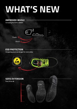 WHAT’S NEW IMPROVED INSOLE Increasing the foot’s comfort 44 Foam 44 Arch support zone Arch support zone V ent air V ent air Mesh ESD PROTECTION Dissipating electrical charges for more safety SIZES EXTENSION From 35 to 48 8