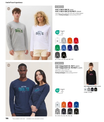 GM MURBFN DBWH OR RDULGM ORDGRDRBWHKGDBNYLONG SLEEVESLONG SLEEVES150 gr190 grXS / S / M / L / XL / XXL / 3XL / 4XL / 5XLXS* / S / M / L / XL / XXL / 3XL / 4XL* / 5XL*SOL%u2019S Imperial LSL KIDS S04238WH GM FN DBSOL%u2019S MONARCH S11420SOL%u2019S MONARCH WOMEN S04443Long sleeve T-shirt. Jersey 150. 100% semi-combed ringspun cotton Printing techniques Screen printing,E,TDT,TR,TTSOL%u2019S Imperial LSL MEN S02074SOL%u2019S Imperial LSL WOMEN S02075Long sleeve T-shirt. Jersey 190. 100% semi-combed ringspun cotton Printing techniques Screen printing,E,TDT,TR,TT*Sizes available in some colors Available in men%u2019s and women%u2019s versions4 YEARS - 12 YEARS98End of Year Experience