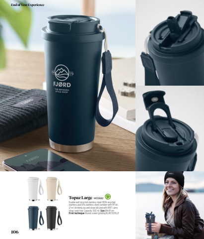 06851303Topaz Large MO2662Double wall recycled stainless steel (90% recycled stainless and 10% stainless steel) tumbler with PP lid (2-in-1 drinking sip and straw lid) and with RPET carry strap. Leak-free. Capacity: 500 ml. Size %u00d89x19 cm Print technique Round screen printing,RL,RD,TD,TR,L,P106End of Year Experience
