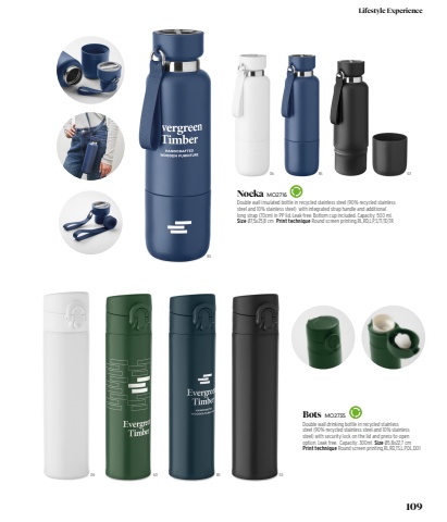 8506 60 85 0306 85 03Noeka MO2716Double wall insulated bottle in recycled stainless steel (90% recycled stainless steel and 10% stainless steel) with integrated strap handle and additional long strap (70cm) in PP lid. Leak-free. Bottom cup included. Capacity: 500 ml. Size %u00d87,5x25,8 cm Print technique Round screen printing,RL,RD,L,P,S,T1,TD,TRBots MO2735Double wall drinking bottle in recycled stainless steel (90% recycled stainless steel and 10% stainless steel) with security lock on the lid and press-to-open option. Leak free. Capacity: 300ml. Size %u00d85,8x22,7 cm Print technique Round screen printing,RL,RD,TS,L,P,DL,DO1109Lifestyle Experience