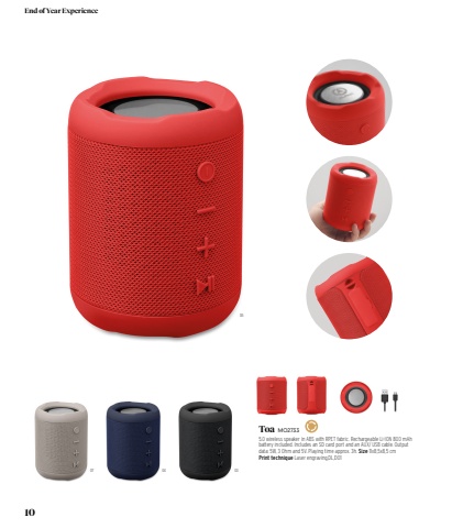 07 04 0305Toa MO27335.0 wireless speaker in ABS with RPET fabric. Rechargeable Li-ION 800 mAh battery included. Includes an SD card port and an AUX/ USB cable. Output data: 5W, 3 Ohm and 5V. Playing time approx. 3h. Size 11x8,5x8,5 cm Print technique Laser engraving,DL,DO110End of Year Experience