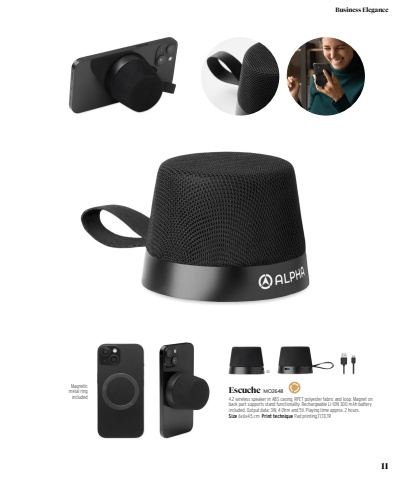03Escuche MO26484.2 wireless speaker in ABS casing, RPET polyester fabric and loop. Magnet on back part supports stand functionality. Rechargeable Li-ION 300 mAh battery included. Output data: 3W, 4 Ohm and 5V. Playing time approx. 2 hours. Size 6x6x4,5 cm Print technique Pad printing,T1,TD,TRMagnetic metal ring included11Business Elegance