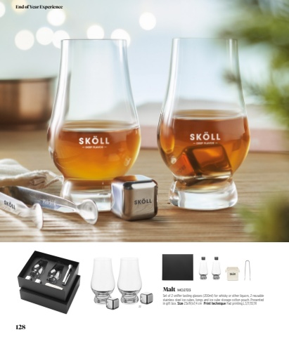 22Malt MO2723Set of 2 sniffer tasting glasses (200ml) for whisky or other liquors, 2 reusable stainless steel ice cubes, tongs and ice cube storage cotton pouch. Presented in gift box. Size 23x19,1x7,4 cm Print technique Pad printing,L,S,T1,TD,TR128End of Year Experience