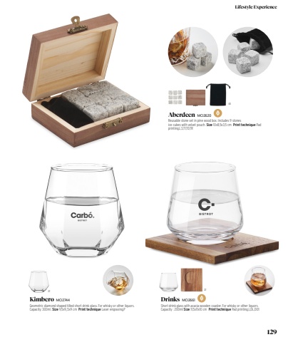 4022 22Aberdeen MO2620Reusable stone set in pine wood box. Includes 9 stones ice cubes with velvet pouch. Size 10x8,5x3,5 cm Print technique Pad printing,L,S,T1,TD,TRKimbero MO2744Geometric diamond shaped tilted short drink glass. For whisky or other liquors. Capacity: 300ml. Size 9,5x9,,5x9 cm Print technique Laser engraving,PDrinks MO2661Short drink glass with acacia wooden coaster. For whisky or other liquors. Capacity : 200ml Size 11,5x11x10 cm Print technique Pad printing,L,DL,DO1129Lifestyle Experience