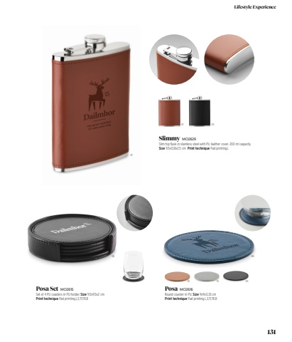 01010303 8501 15 03Slimmy MO2629Slim hip flask in stainless steel with PU-leather cover. 200 ml capacity. Size 9,5x13,8x2,5 cm Print technique Pad printing,LPosa MO2616Round coaster in PU. Size 9x9x0,33 cm Print technique Pad printing,L,S,T1,TR,BPosa Set MO2615Set of 4 PU coasters in PU holder. Size 9,5x9,5x2 cm Print technique Pad printing,L,S,T1,TR,B131Lifestyle Experience
