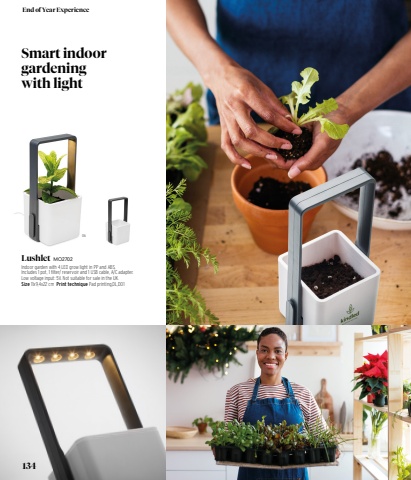 06Lushlet MO2702Indoor garden with 4 LED grow light in PP and ABS. Includes 1 pot, 1 filter/ reservoir and 1 USB cable, A/C adapter. Low voltage input: 5V. Not suitable for sale in the UK. Size 11x9,4x22 cm Print technique Pad printing,DL,DO1Smart indoor gardening with light134End of Year Experience