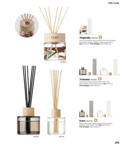 MO2706 MO2704MO2703220303 2222Magnolia MO2703Glass jar with wooden fragrance diffuser with flower decoration inside, with 6 reed stick. Fragrance: vanilla. Capacity: 100ml. Size 7,1x7,1x23 cm Print technique Pad printing,RS,L,DLNoiroma MO2706Glass jar with wooden fragrance diffuser with 6 reed sticks. Fragrance: vanilla. Capacity: 100 ml. Size 7x7x9,7 cm Print technique Pad printing,RS,L,DLKnos MO2704Glass jar with wooden fragrance diffuser with 6 reed stick. Fragrance: vanilla. Capacity: 50ml. Size 4,9x4,9x5,8 cm Print technique Pad printing,RS,L,DL139Daily Living