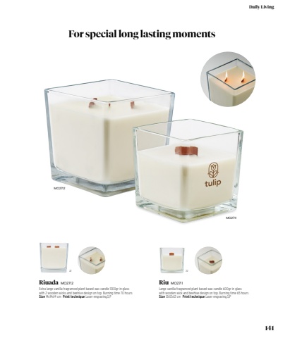 22 22MO2712MO2711Riu MO2711Large vanilla fragranced plant based wax candle 600gr in glass with wooden wick and beehive design on top. Burning time 65 hours Size 12x12x12 cm Print technique Laser engraving,S,PRiuada MO2712Extra large vanilla fragranced plant based wax candle 1300gr in glass with 2 wooden wicks and beehive design on top. Burning time 70 hours Size 14x14x14 cm Print technique Laser engraving,S,PFor special long lasting moments141Daily Living