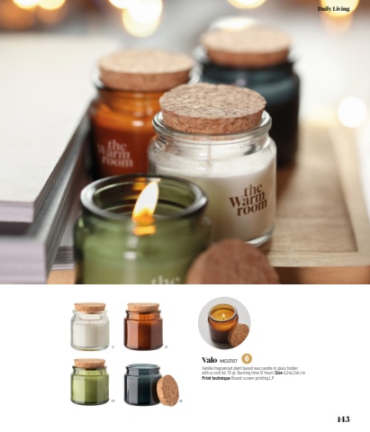 13090185Valo MO2707Vanilla fragranced plant based wax candle in glass holder with a cork lid. 70 gr. Burning time 12 hours Size 6,2x6,2x6 cm Print technique Round screen printing,L,P143Daily Living
