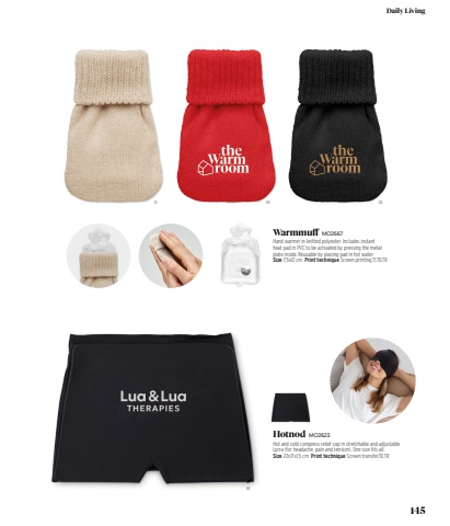 13 05 0303Hotnod MO2623Hot and cold compress relief cap in stretchable and adjustable Lycra (for headache, pain and tension). One size fits all. Size 22x17x1,5 cm Print technique Screen transfer,TD,TRWarmmuff MO2667Hand warmer in knitted polyester. Includes instant heat pad in PVC to be activated by pressing the metal plate inside. Reusable by placing pad in hot water. Size 7,5x12 cm Print technique Screen printing,T1,TD,TR145Daily Living