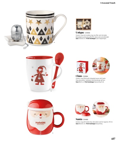 990505Santa CX1492Ceramic mug with Santa Claus decoration and lid. Capacity: 370 ml. Size %u00d88,5x11,5 cm Print technique Pad printingClaus CX1304Ceramic mug 250ml with integrated spoon with Santa Claus decoration. Individual matching design gift box. Size %u00d88x10 cm Print technique Pad printing,TC,DLUnique CX1443Ceramic mug set including mug, tea filter and mini plate. Presented in carton box with PVC sleeve and cord with label. Size 21x15x9,5 cm Print technique Laser engraving,DL157A Seasonal Touch