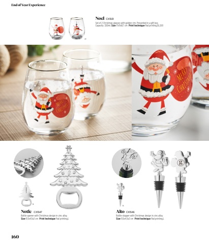 16 1622Notle CX1547Bottle opener with Christmas design in zinc alloy. Size 11,5x4,5x2 cm Print technique Pad printing,LAlto CX1546Bottle stopper with Christmas design in zinc alloy. Size 11,5x4,5x2 cm Print technique Pad printing,LNoel CX1501Set of 2 Christmas glasses with golden rim. Presented in a gift box. Capacity: 330ml. Size 17x11x8,7 cm Print technique Pad printing,DL,DO1160End of Year Experience