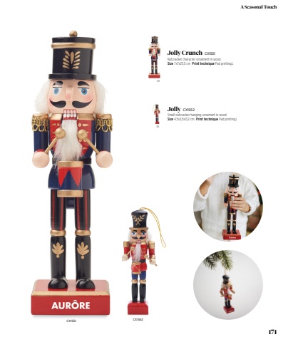 CX1551 CX15520505Jolly CX1552Small nutcracker hanging ornament in wood. Size 4,5x3,5x13,2 cm Print technique Pad printing,LJolly Crunch CX1551Nutcracker character ornament in wood. Size 7x7x25,5 cm Print technique Pad printing,L171A Seasonal Touch