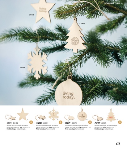 CX1476CX1474CX1475CX147340 40 40 40Esty CX1476Wooden MDF star shaped decoration hanger with jute cord. Size 7,9x6x0,2 cm Print technique Pad printing,S,LNeuy CX1474Wooden snowflake shaped decoration hanger with jute cord. Size 7,9x7x0,2 cm Print technique Pad printing,S,LBaly CX1473Wooden MDF bauble shaped decoration hanger with jute cord. Size 8,9x%u00d86,9x0,2 cm Print technique Pad printing,S,LArby CX1475Wooden tree shaped decoration hanger with jute cord. Size 7,9x6,3x0,2 cm Print technique Pad printing,S,L175A Seasonal Touch