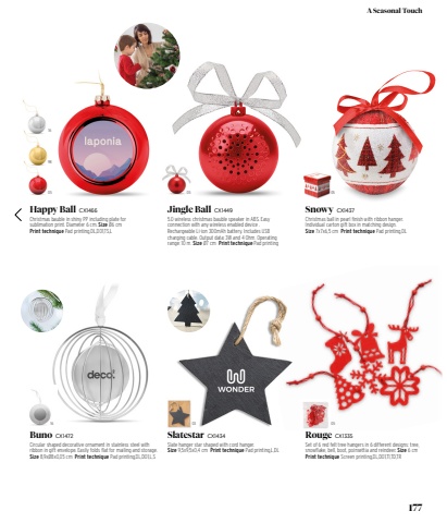 05 05 05981616 03 05Rouge CX1335Set of 6 red felt tree hangers in 6 different designs: tree, snowflake, bell, boot, poinsettia and reindeer. Size 6 cm Print technique Screen printing,DL,DO1,T1,TD,TRSnowy CX1437Christmas ball in pearl finish with ribbon hanger. Individual carton gift box in matching design. Size 7x7x6,5 cm Print technique Pad printing,DLSlatestar CX1434Slate hanger star shaped with cord hanger. Size 9,5x9,5x0,4 cm Print technique Pad printing,L,DLJingle Ball CX14495.0 wireless christmas bauble speaker in ABS. Easy connection with any wireless enabled device . Rechargeable Li-ion 300mAh battery. Includes USB charging cable. Output data: 3W and 4 Ohm. Operating range: 10 m. Size %u00d87 cm Print technique Pad printingBuno CX1472Circular shaped decorative ornament in stainless steel with ribbon in gift envelope. Easily folds flat for mailing and storage. Size 8,9x%u00d88x0,05 cm Print technique Pad printing,DL,DO1,L,SHappy Ball CX1466Christmas bauble in shiny PP including plate for sublimation print. Diameter 6 cm. Size %u00d86 cm Print technique Pad printing,DL,DO1,TS,L177A Seasonal Touch