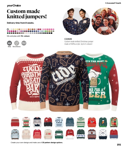 100MOQCG1020Custom made knitted Christmas jumper made of 100% acrylic. Up to 5 colours! Custom made knitted jumpers!Delivery time from 8 weeks.Mix and play with 70+ coloursMen & WomenCreate your own design and make use of 20 pattern design options.181A Seasonal Touch