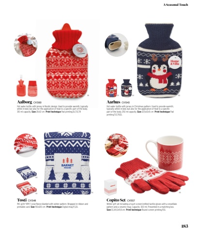 05 05 04 0404 05 0504Copito Set CX1557Winter gift set including a touch screen knitted tactile gloves with a snowflake pattern and a ceramic mug. Capacity: 300 ml. Presented in a matching box. Size 12,2x9,2x9,8 cm Print technique Round screen printing,P,DLAarhus CX1543Hot water bottle with jersey in Christmas pattern. Used to provide warmth, typically whilst in bed, but also for the application of heat to a specific part of the body. 250 ml capacity. Size 22,5x12x5 cm Print technique Pad printing,T1,E,TR,DLTosti CX1548190 gr/m%u00b2 RPET coral fleece blanket with winter pattern. Wrapped in ribbon and printable card. Size 150x120 cm Print technique Digital inlay,P,S,DLAalborg CX1360Hot water bottle with jersey in Nordic design. Used to provide warmth, typically whilst in bed, but also for the application of heat to a specific part of the body. 310 ml capacity. Size 20x12 cm Print technique Pad printing,DL,T1,E,TR183A Seasonal Touch