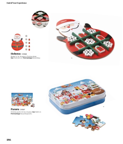 0599Hohotoe CX1568Wooden Tic Tac Toe game in Christmas design. Size 17,5x24,3x1,5 cm Print technique Pad printing,LPazuru CX1507Christmas puzzle in tin box. 60 pieces. Size 13x8x4 cm Print technique Pad printing,DL,DO1,L186End of Year Experience